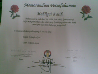 Menyelusuri kenangan silam, kira kira 3 tahun yang lalu, pada 19 Jun 2005, kami menanda tangani satu memorandum persefahaman untuk menghidupkan nilai nilai yang kami kongsi bersama demi mencapai wawasan keluarga yang abadi untuk membelai kasih sayang di antara kami suami isteri. Manifestasi hasil dari Kursus Mahligai Kasih 2005 dan sepanjang tempoh itu, ayah adam dan ibu adam cuba menjadi pasangan yang mengamalkan nilai nilai yang kami fikirkan terbaik. Bagaikan lirik nyanyian P Ramlee, “Sedangkan lidah lagi tergigit, ini kan pula suami isteri” , Gelora badai ribut taufan memang melanda namun semuanya telah diduga dan dijangka. Kursus Mahligai Kasih 2005 telah memberikan sedikit tips dan panduan untuk menghadapinya. Dalam kursus tersebut, kami sedar bahawa kami memang berbeza. Ayah adam seorang lelaki dan ibu adam seorang wanita yang mempunyai hardware dan software yang tersendiri. Hanya melalui komunikasi yang effektif sahaja, kita boleh mengenali antara satu sama lagi. “Tak kenal maka tak cinta”, rasanya kami telah buktikan bahawa memang betul. Sepanjang tempoh 2 tahun kami bercinta sebagai sepasang suami isteri yang lebih ceria, lebih menyayangi dan lebih memahami antara satu sama lain.